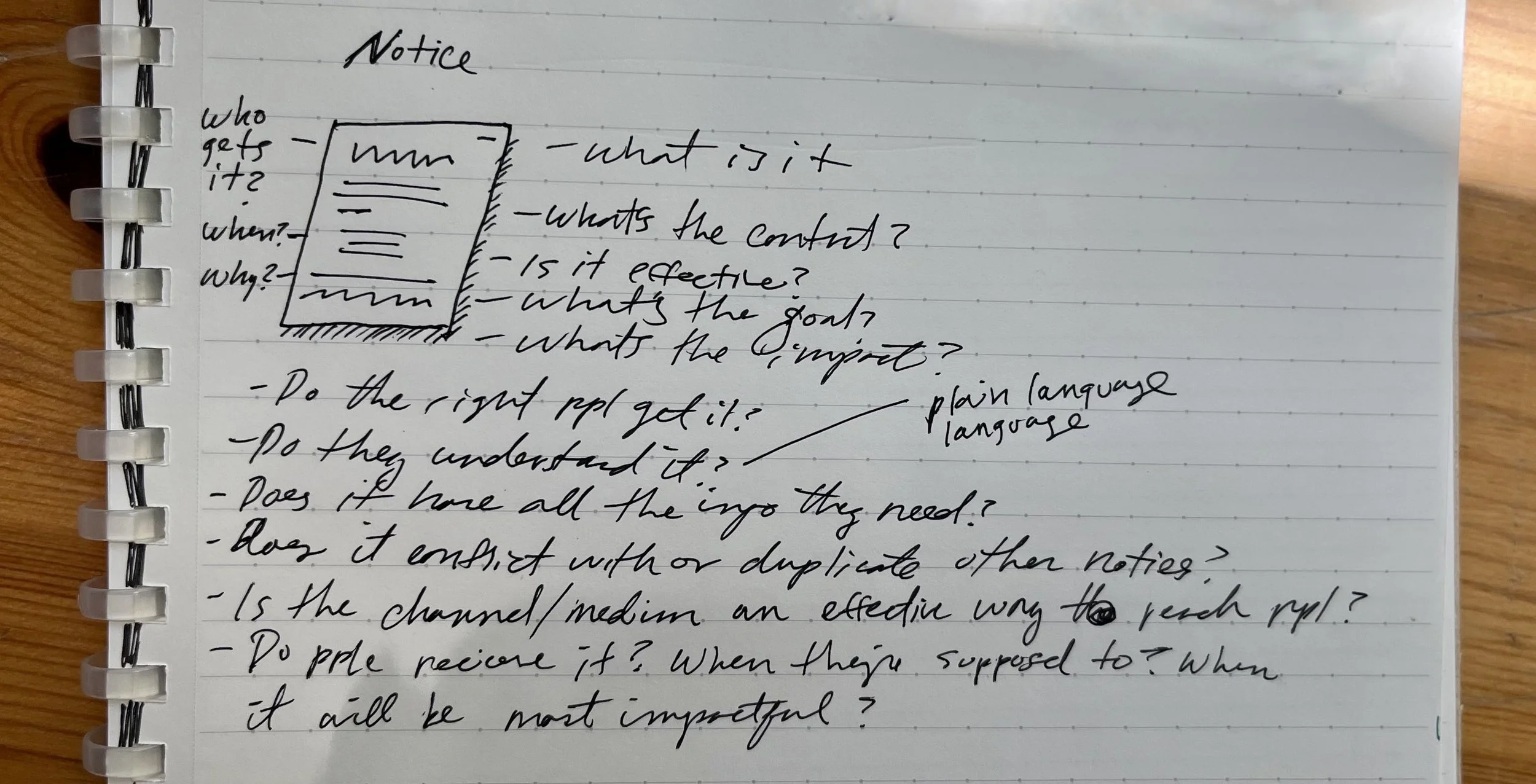 Next, I put together a discovery roadmap to help us understand the problem space and narrow in on an intervention. My goal was to fully understand the user experience of notices through qualitative and quantitative data, and find opportunities to address the issue. I planned out a schedule of stakeholder and user interviews, a project to identify, catalog and map notices, an audit of all notices, and eventually an insights report and pilot. Working with the PM, I created a flexible work plan that would keep us accountable to our partner, while allow us to pivot in response to research findings.